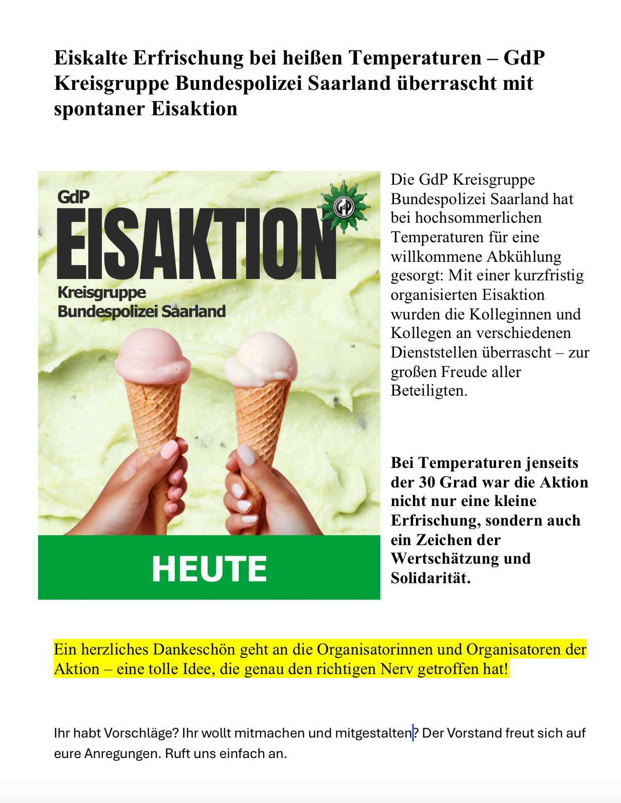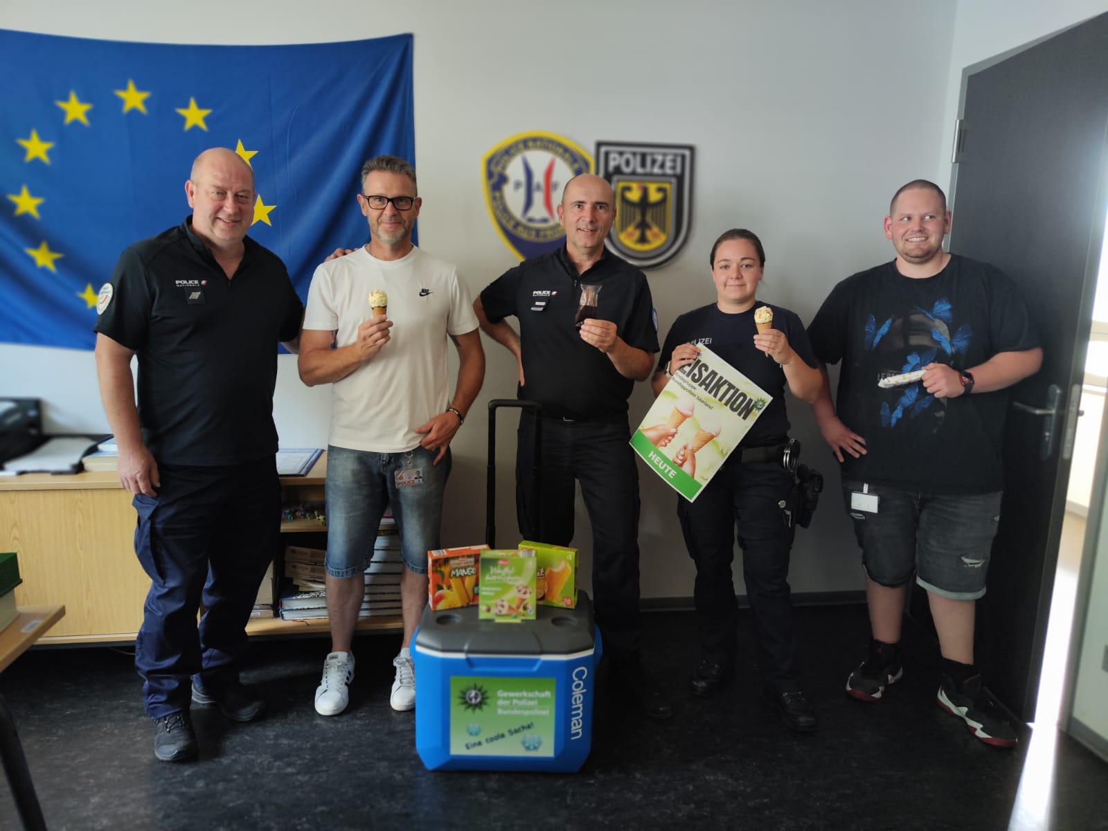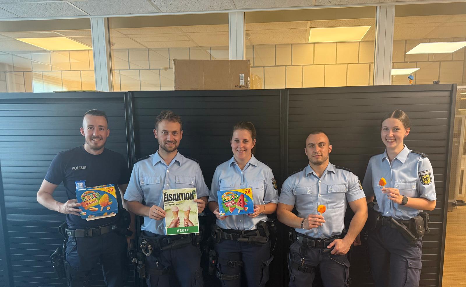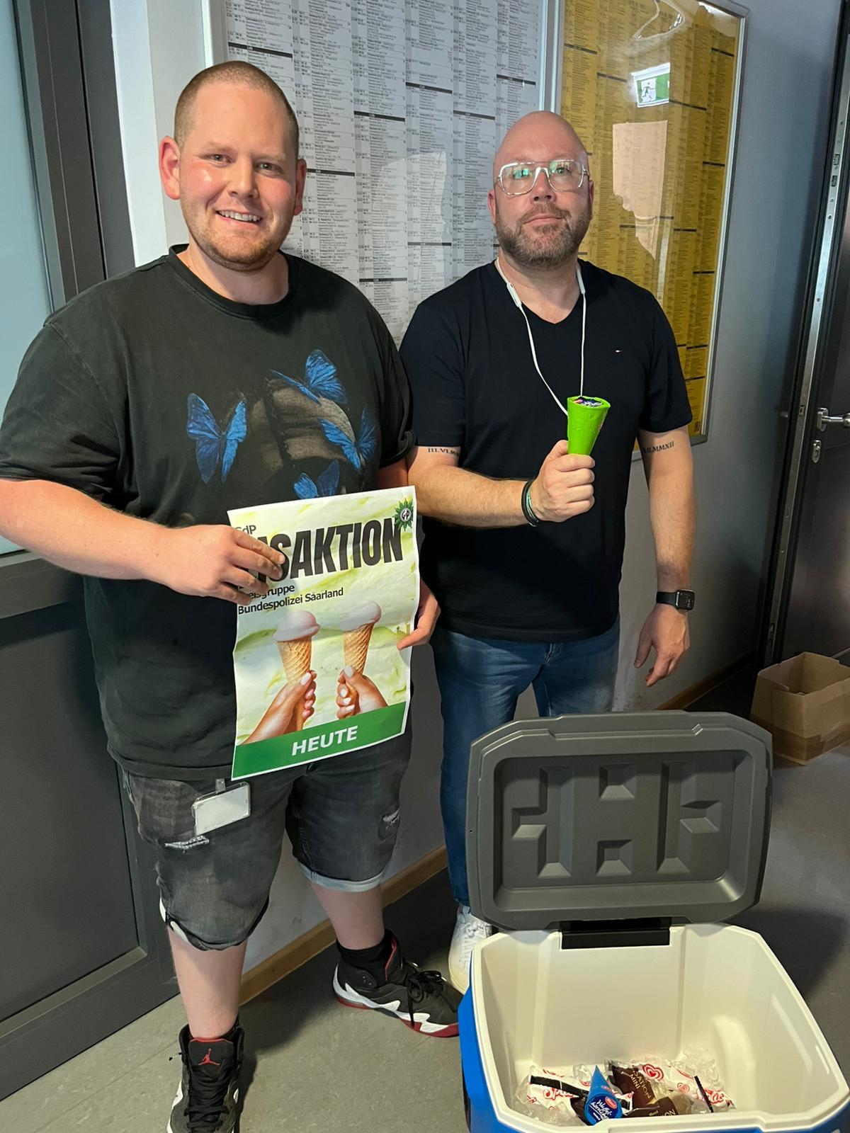 Eiskalte Erfrischung an heißen Temperaturen Veröffentlicht am 2. Juli 2025 von Vorstand-rv Eiskalte Erfrischung bei heißen Temperaturen – GdP Kreisgruppe Bundespolizei Saarland überrascht mit spontaner Eisaktion Saarbrücken, 02.07.2025 Nachfolgend einige Fotos von der spontanen „Abkühl – Aktion“